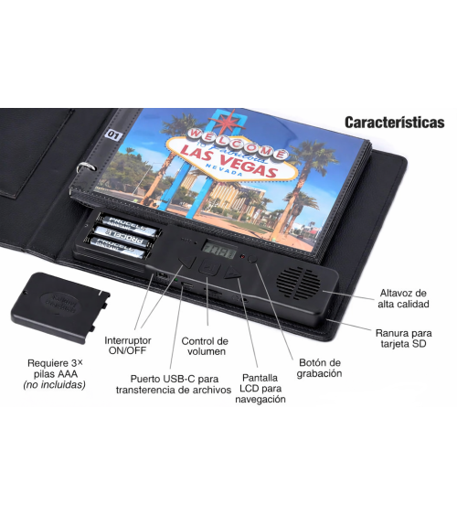- Permite grabar un mensaje diferente en cada una de sus 30 páginas mediante el micrófono integrado.