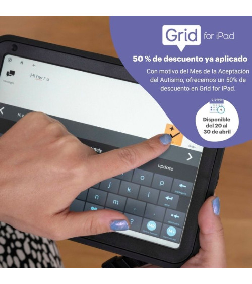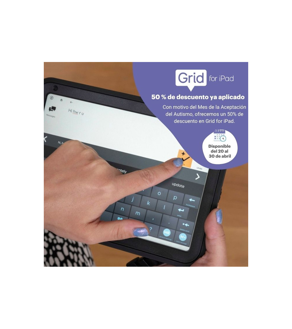 Ref: BJ-GipadUna potente app de comunicación aumentativa y alternativa (CAA) diseñada para personas que necesitan apoyo para comunicarse. Aprovecha la promoción por el Mes de la Aceptación del Autismo: un 50% de descuento en Grid for iPad.